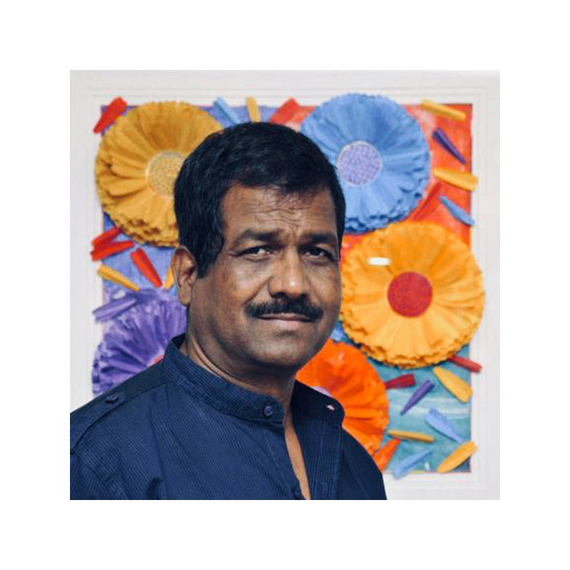 Jagadish Chinthala was born in 1956 Jagdish holds a Diploma in Painting from College of Fine Arts, JNTU, Hyderabad and Post Diploma in Mural Design from M.S.University Baroda. He has received a Research Grant from Lalit Kala Academy, British Council and Charles Wallace India Traveling Grant for study with Henry Moore. He has received awards from All India Exhibition, A.P. State Lalit Kala Exhibition Triennale International Exhibition India. Jagdish sculpts fibre glass masks of people he sees from all walks of life. They are inspired by the Art Deco work. His famous works are three dimensional and inspired by folk sculptures. His most used medium is Aluminium.