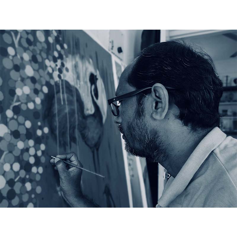 Born in the year 1977 in Hyderabad. Kumaraswamy Completed his MFA from SN School of Fine Arts, Hyderabad, in the year 2004 and BFA from SV Collage of Fine Arts, Hyderabad. Kumaraswamy uses stylised women figures, animals and birds in his paintings with natural forms like trees and leaves to show that nature is beautiful because it is alive. He juxtaposes fluttering birds, animals, blooming trees, full moon and sun, all that may embody beauty with there recurring elements. His scheme of colour is simple yet vibrant and the application, with a fine dry brush strokes, is exuberant creating highlights and depth. His ideas revolve around nature's enchanting beauty and its relationship with its surroundings.