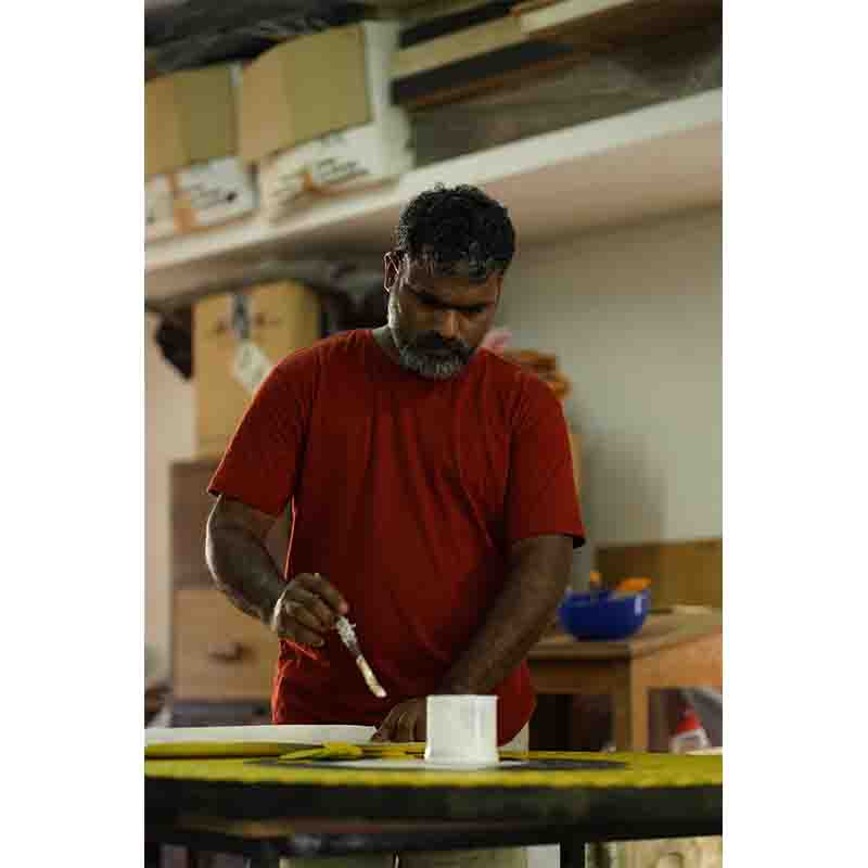 Saravanan Parasuraman has post-graduated from Government College of fine arts, Chennai, 2006 and graduated from Government College of fine arts, Chennai, India, 2004. Saravanan's creations have a sense of raw energy, drawing inspiration from nature and ordinary life in the countryside of rural India, particularly Tamil Nadu, where he spent his formative years. Fishing nets, local proverbs and idiomatic expressions, jackfruit, old-fashioned tools, and anthills all find themselves conceptualized in Parasuraman's work, translated into different materials and shaped into physical objects that resonate with depth and underlying messages.
