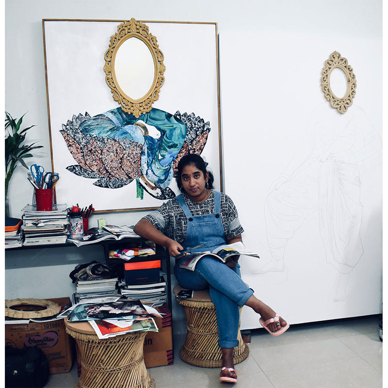 Vysali Graduated in painting from Andhra University, Visakhapatnam, in the year 2011 and post graduated in graphics from Vishva Bharathi University, Shantiniketan, in the year 2013. Vysali works on the concept of technological interventions and its influences on the society, focusing the experiences and influences of changing lifestyles of the people in the present modern era. Apart from woodcuts and wood engraving panels, Vysali creates amazing collages with paper, wood, mirrors, etc, binding them together to create the amazing portraits of the contemporary human. Vysali lives and worked in Hyderabad, Telangana.