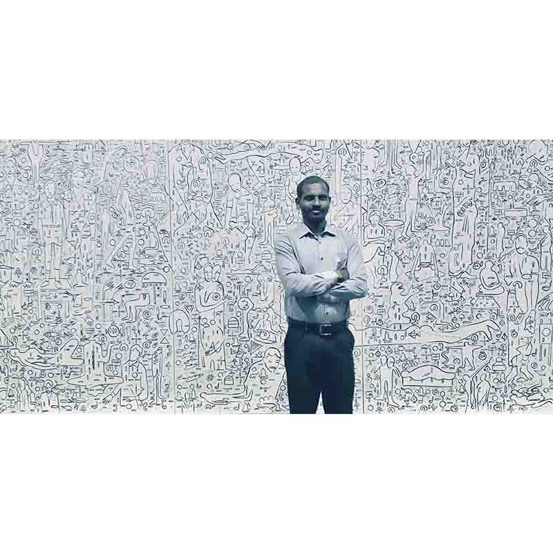 Venkat Ramulu Jogu was born in 1982. Venkat completed his  MVA in Printmaking from Kalabhavan, Shantiniketan and a BFA in Painting from J.N.T.U., Hyderabad. The 'lines', in the works by Venkat move as instinctively as a heart throbs. Just like a heart, works on its own and does not need attention or effort for its functioning, the visual imagery that evolves on the picture surface rendered by Venkat flows just as naturally. Non descriptive and non illustrative these forms are abstract in their own way. They are ambiguous, minimalistic and abbreviated. They can be thoughts, people, creatures or instances, yet it is their shielded, unknown and veiled symbolism that appeals the viewer. The composition holds both geometric and figurative overlapping often correlated to narrate his mindscapes intuitively, if not abstract sense. The elements that were reduced to their basic forms with subtle distortions in terms of tones and shapes might have definite meaning but serve as beautiful forms catering to the needs of the composition.
